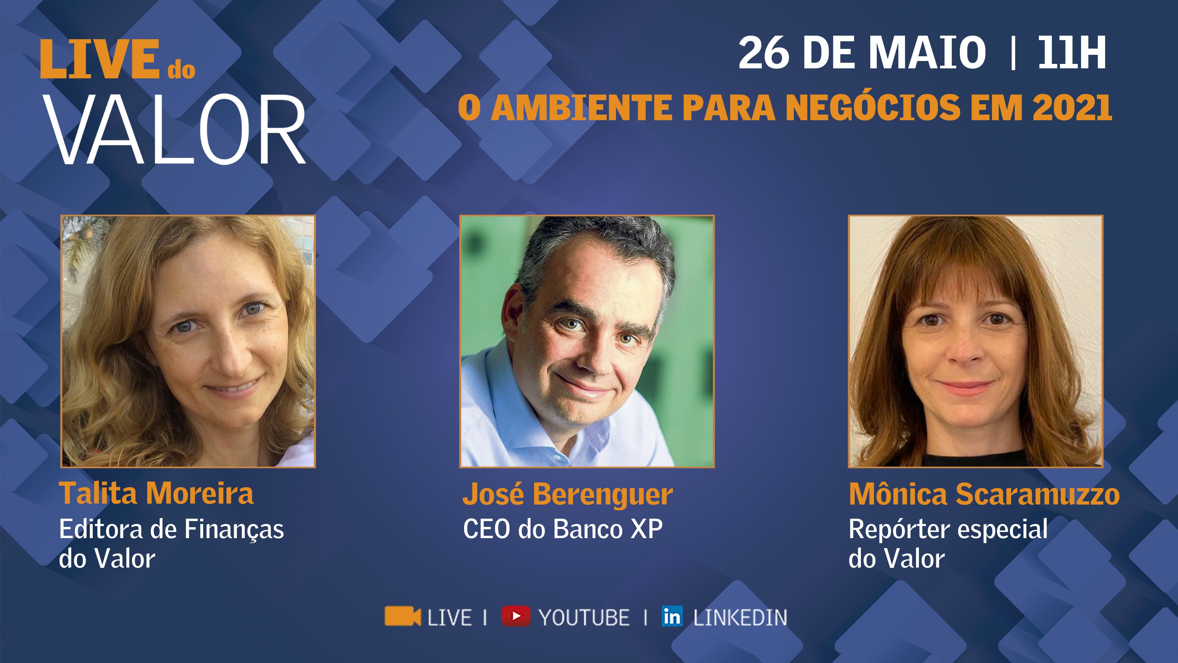 O presidente do banco XP, José Berenguer, é o entrevistado desta quarta-feira, dia 26, às 11h, na Live do Valor.